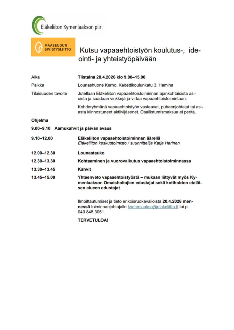 Kymenlaakson piirin vapaaehtoistyön koulutus-, ideointi ja yhteistyöpäivä ti 28.4. klo 9-15.00 Haminassa